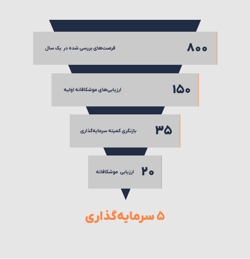 آمارها نشان میدهد که از هر 800 فرصت سرمایهگذاری شناسایی شده 5 مورد منجر به سرمایهگذاری میشود. مراحل فرآیند سرمایهگذاری به شکل زیر است:
