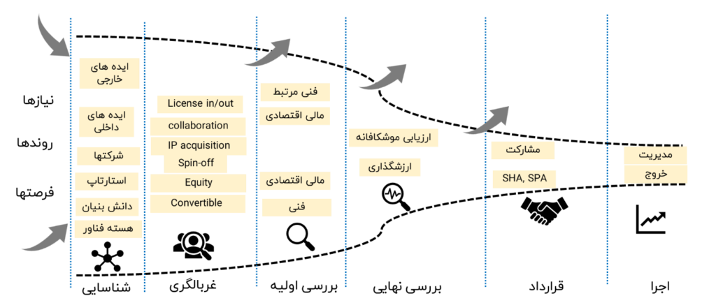 فرآیند و اجرای شرکت، در نحوه انتخاب طرحها شامل شناسایی، غربالگری، بررسی اولیه، بررسی نهایی، قرارداد و اجرا است. با توجه به اینکه مدل فعالیت این صندوق سرمایهگذاری خطرپذیر شرکتی است و تمرکز آن بر استارتاپها و شرکتهای دانشبنیان در مرحلهی میان (Mid-Stage) و نهایی (Late-Stage) است شاخصهای غربالگری به شرح زیر هستند: